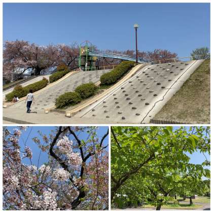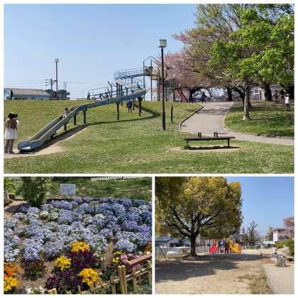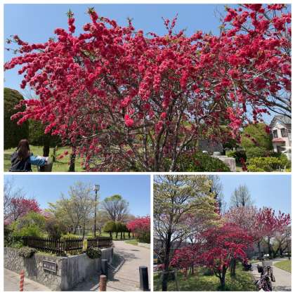 公園の入り口で赤とピンクの花をたくさんつけた木が迎えてくれました。大きなすべり台があってみんな楽しそうに遊んでいました。