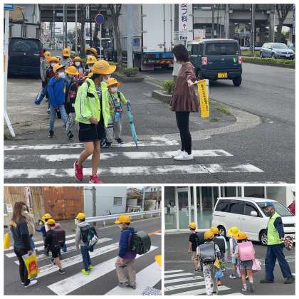 子どもたちは、自転車に接触したり、地域の方の移動を遮ったりしないために、班ごとに一列で登下校します。列が長くなるので、特に道幅の広い横断歩道を渡る場所は、青信号が点滅する前にストップをかけて、道路上に子どもが取り残されることがないように心配りしていただいています。