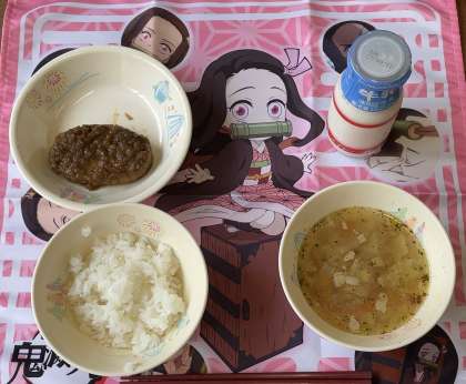 ごはん、ぎゅうにゅう、はるキャベツのスープ、ハンバーグのオニオンソースがけ