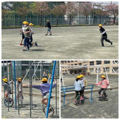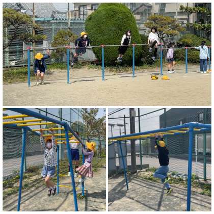 中間放課の運動場の様子です。かけっこや一輪車、ブランコ、うんてい、鉄棒などで元気いっぱい運動しました。