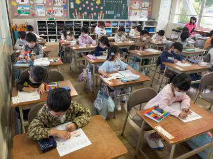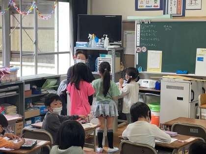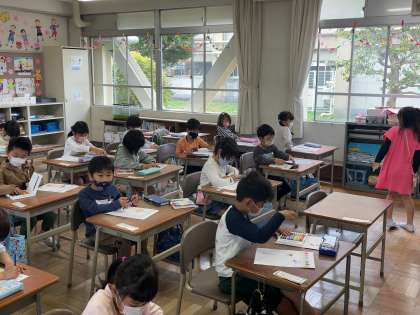 1年生の昨日の授業の様子です。自己紹介するカードづくりをしながら、順番に先生の所に提出物を届けに行きました。