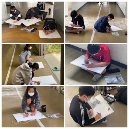6年生の昨日の図工の授業の様子です。描きたい場所を画用紙の上に表現しようと、一生懸命鉛筆を走らせていました。少しずつ形になってきましたね。今までお世話になった愛着の想いも込めて、すてきな作品になるといいですね。
