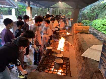 火おこしや飯盒を使ってのお米炊き、大きな鍋でのカレー作りなど、初めての経験がいっぱいだったと思いますが、自分の役割をしっかりと理解して、みんなで協力して作業を進めることができましたね。感染症対策、やけど、けがなどに気をつけて、調理を楽しむことができる時間になりました。よくがんばりましたね。