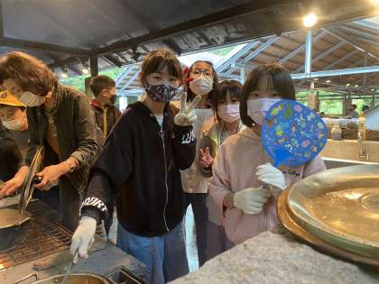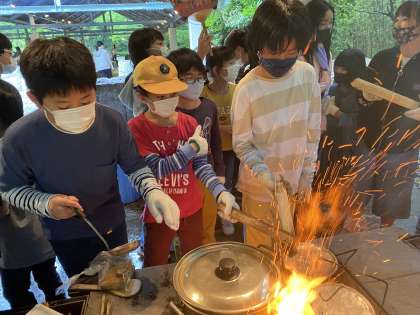5月13日(金) 野外教育活動 5年生 公開日 2022/05/13 更新日 2022/05/13 5年 野外教育活動プレイバック。 火も大きくなり、いよいよ完成。先ほど作った器にもりつけます。 5年生