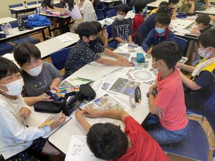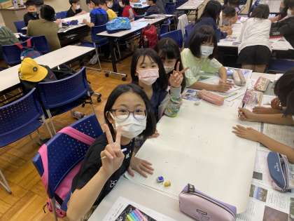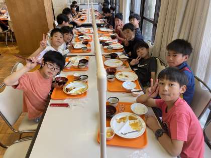 朝食のあとは、午前の活動です。雨天のため、グループで考えたキャンプをあらわす漢字一字のイラストを記しました。