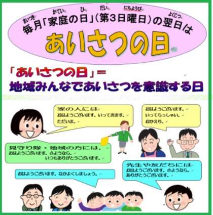 学校では「あ」明るく、「い」いつも、「さ」あいてよりも先に、「つ」つづけるをスローガンにあいさつする」ことの大切さについて指導をしています。今後も、あいさつについては、地域全体で進めていきたいと考えていますので、ご理解ご協力、よろしくお願いします。