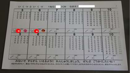 「いくつといくつ」の学習をより定着させるため、2枚目の写真のような表をお子様に配布します。ご家庭でお子様が暗唱できるか聞いていただけると幸いです。何も見ずに暗唱ができるようになったら、保護者の欄にサインをしてください。保護者の欄にサインをもらえたところから、学校で各クラスの担任がもう一度聞きます。(授業では担任が暗唱を聞く時間を設けられないため休み時間に暗唱を聞く時間を設けます。)たしざんやひきざんの基礎となる学習になりますので、ご協力をお願いします。