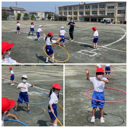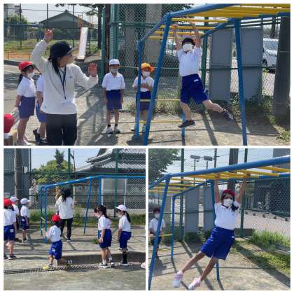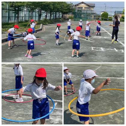 1年生の体育の授業の様子です。フラフープやうんていを使って体を大きく動かす運動に挑戦していました。はじめはうまく体が動かせなくても、練習していくうちにとても上手になっていきましたね。