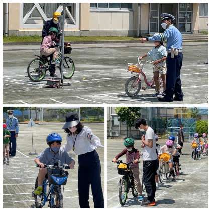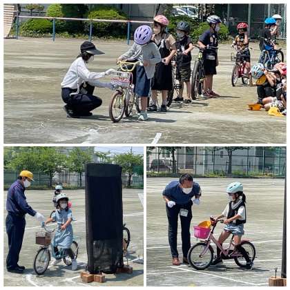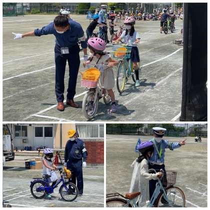3年生の交通安全教室の様子です。自転車の乗り方や交差点にさしかかった時に気をつけることなど、一宮警察の方からお話を伺った後、実際に運動場に書かれた道路の上で自転車の乗って確認をしました。自転車は便利ですが、その分危険を伴います。安全に利用できるように、今日学んだことを普段の生活の中で実践していきましょうね。