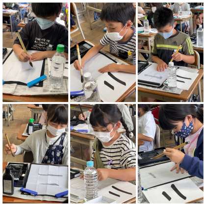 3年生の書写の授業の様子です。道具の準備のしかたについてしっかりと理解することができましたね。今日は、墨ではなく水を使って漢字の「二」を書きました。筆を立てて、のびのびと大きく書くことができましたね。とてもよい集中力でした!