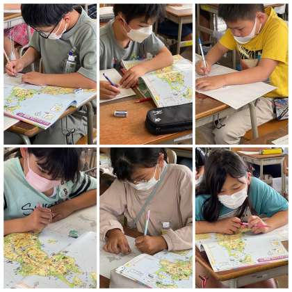 4年生の社会科の授業の様子です。「北海道・東北地方についての文をかこう」というテーマで学習を進めていました。地図帳の中から情報を読み取って、地域の特徴がわかる文を作っていきました。