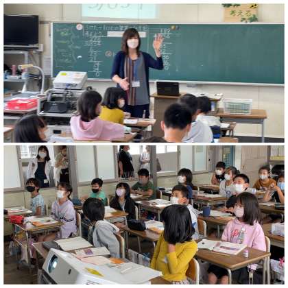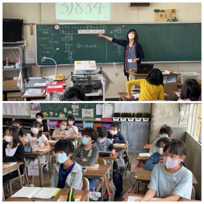 4年生の算数の授業のようすです。「3けた÷1けたのひっ算の仕方を考えよう」という目標で授業を進めていました。けた数が増えても、今まで学んできた「たてる」→「かける」→「ひく」→「おろす」の順序で計算していくと答えを出すことができることがよくわかりましたね。