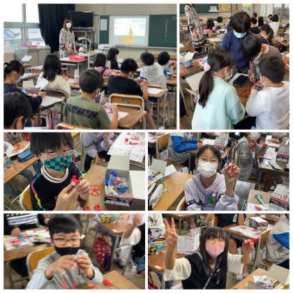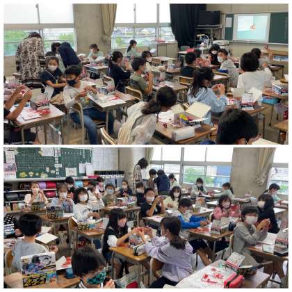 4年生の理化の授業の様子です。電気のはたらきについて学ぶためにキッドの組み立てを行っていました。モーターを使ってうまく本体を組み立てられるように、説明書を見ながらがんばっていましたね。