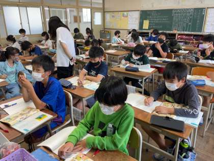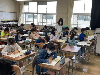 5年生の国語の授業の様子です。「図書館の人になったつもりで、説明文をかこう」というめあてで、作文に取り組んでいました。「配置」「最新」「借りる」「区別」「公共」「児童書」などなど、キーワードになる言葉を使って、わかりやすく説明しようと頑張っていましたね。