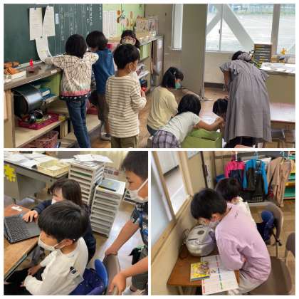 5月21日(土) 今日のひまわりさん 公開日 2022/05/21 更新日 2022/05/21 ひまわり組 今日のひまわりさんの教室の様子です。みんな仲良く、道具を使って片づけをしたり、音楽を聴いて勉強したりして過ごしました。ルールを守ってしっかりと生活できましたね。
