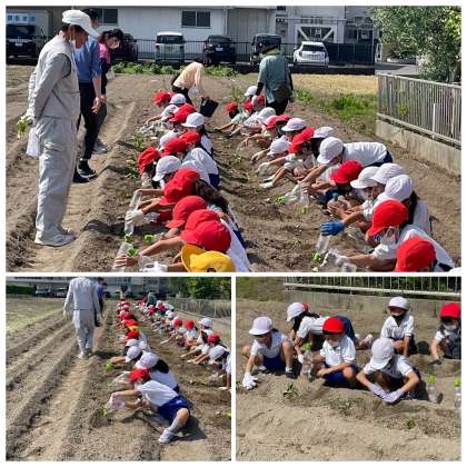 「草取りと雨が降るまでの水やりを頑張ってくださいね」とまとめのお話の中で子どもたちに伝えてくださいました。植物は、種を植えたり苗を植えたりしたばかりの時には、水を欠かしてはいけないものです。今週末は雨降りの予報ですので、それまではしっかりと水をあげなければと思っていましたが、今日の夕方ごろ、ボランティアの方が一輪車いっぱいに水の入ったペットボトルを畑に運んでお水をあげてくださっていました。
