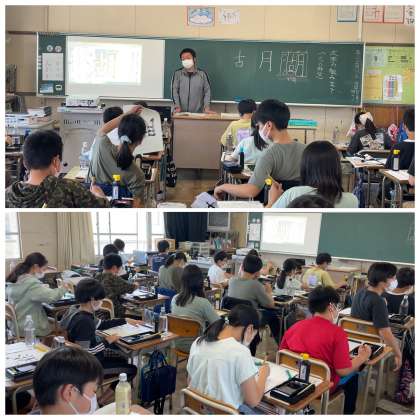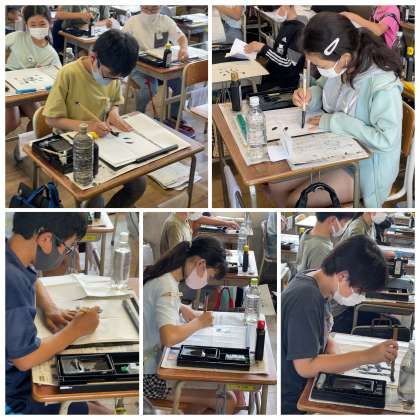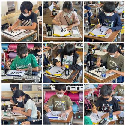 6年生の昨日の書写の授業の様子です。3つの部分からなる「湖」について、文字のバランスを考えながら丁寧に筆を進めていました。