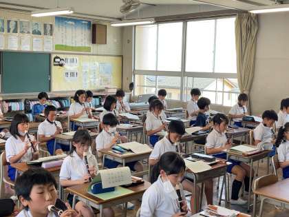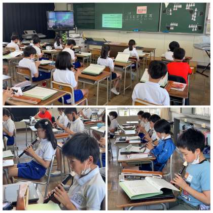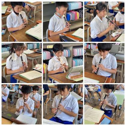 5年生の昨日の音楽の授業の様子です。「茶色の小びん」をリコーダーで演奏していました。タンギングに気をつけて、美しい音色で演奏できていましたね。