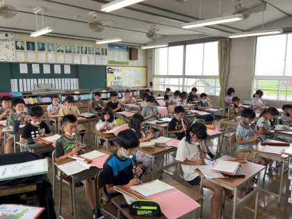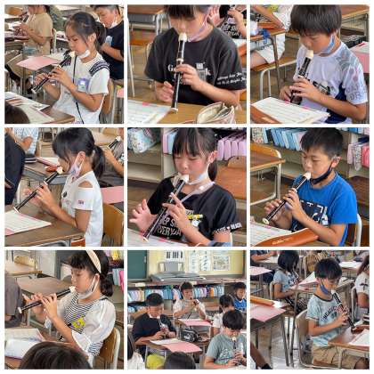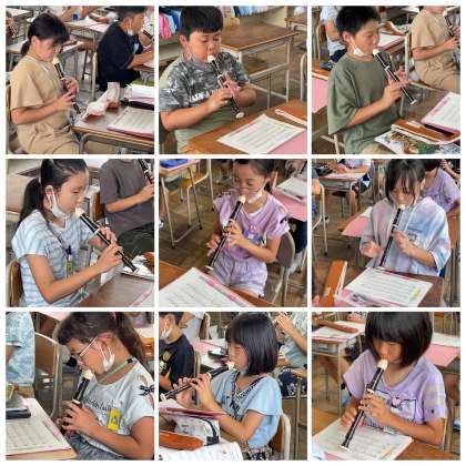 4年生の音楽の授業のようすです。「サミングに挑戦しよう」というテーマで、「ひくい音と高い音の音色を気をつけて演奏しよう」という目標でリコーダーの練習に取り組んでいました。