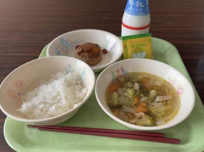 ごはん、ぎゅうにゅう、コンソメスープ、ハンバーグのレモンソース、やさいふりかけ