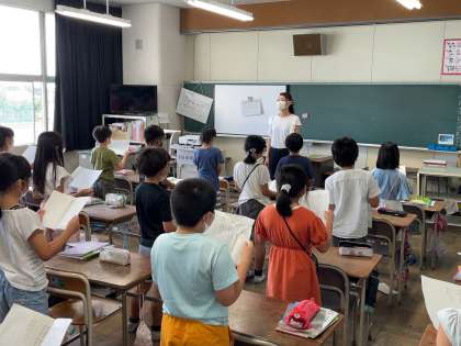 7月14日(木) 詩の朗読【3年国語】 公開日 2022/07/14 更新日 2022/07/14 3年 3年生の詩の朗読のようすです。教務主任の先生に教えてもらった「丹田呼吸法」を意識して、詩の朗読を行っていました。とてもよい響きのある声で、かつ、よくそろっていてすてきな朗読になっていました。みんなの力が集まると大きな力になることを体験できましたね。