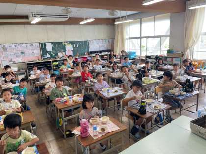 3年生の給食のようすです。準備を協力して素早く行い、とても静かに会食していました。感染症予防のため、黙食が続きますが、おいしい給食に思わず笑みがこぼれますね。1学期の給食も残すところ明日と来週火曜日のあと2回ですね。給食に携わっている方を思い浮かべながら、感謝の気持ちでいただきましょうね!