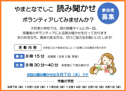 7月15日(金) なでしこフォーラムを配付しました【読み聞かせボランティア】 公開日 2022/07/15 更新日 2022/07/15 ボランティア 読み聞かせボランティアの「やまとなでしこ」さんが7月の読み聞かせ活動の紹介とボランティア募集の案内を作ってくれましたので、お子さんを通じて配付しました。 読み聞かせに興味がある方は、大和東っ子のために参加してみませんか? ➡なでしこフォーラムvol.3はこちらから
