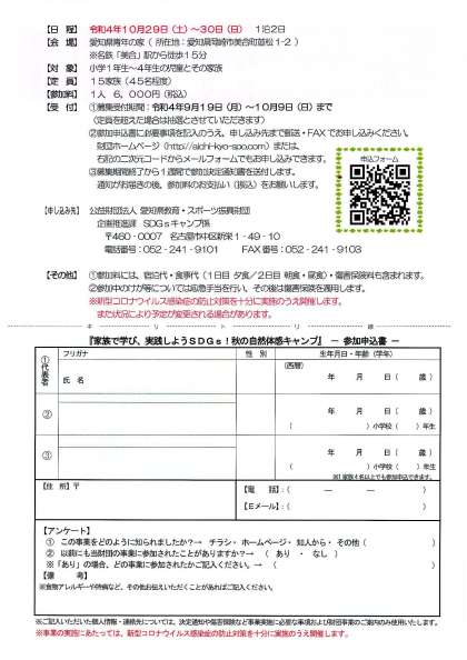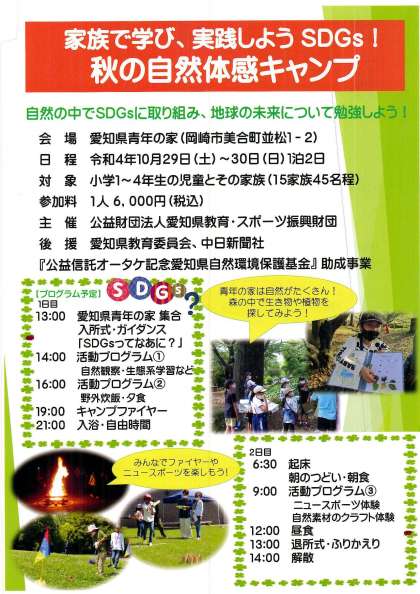 愛知県教育・スポーツ振興財団さんより「家族で学び、実践しようSDGs!秋の自然体感キャンプ」のチラシが大和東小学校に届きましたのでウェブ記事で紹介します。対象は小学1年生から4年生の児童とその家族で、参加料は6,000円です。希望がある方は各自で申し込んでください。