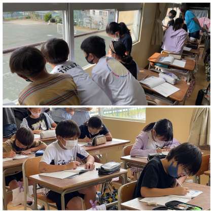 9月20日(火) 雨のあとのグランド【4年理科】 公開日 2022/09/20 更新日 2022/09/20 4年 4年生の理科の授業のようすです。昨日の雨でぬれたグランドのようすを観察しながら、気づいたことについてノートに書きだして意見交換しました。地面の傾きと水の流れ方についての関係をつかむことができましたね。