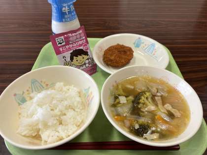 9月20日(火) 9/16(金)の給食です 公開日 2022/09/20 更新日 2022/09/20 ひがしっ子ライフ ごはん、ぎゅうにゅう、コンソメスープ、ミンチカツ、かつおのふりかけ 今日のコンソメスープには、ブロッコリーが入っています。ブロッコリーは、緑色の小さなつぶがたくさん集まっていますが、これは一つ一つが花のつぼみです。ブロッコリーを収穫ずにいると黄色い花がたくさん咲きます。