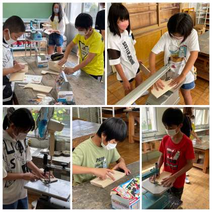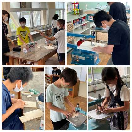 6年生の図工の授業のようすです。テープカッターのデザインを考えて、糸のこで木材から切り出しを行っていました。イメージしたデザインを切りだせるように、集中して板を刃に運んでいましたね。