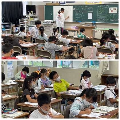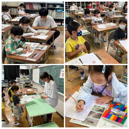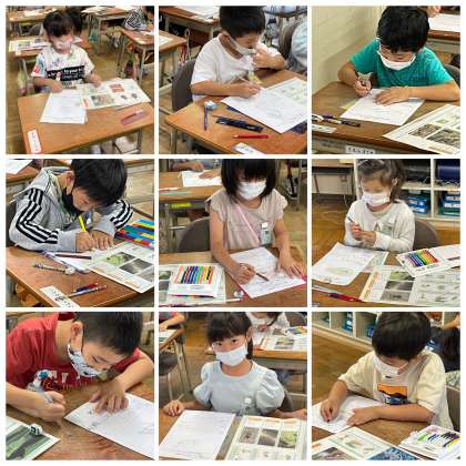 1年生の生活科の授業のようすです。「むしについてしらべたことをまとめよう」というめあてで、学んだことや調べたことをレポートにまとめて友だちに伝える準備をしていました。