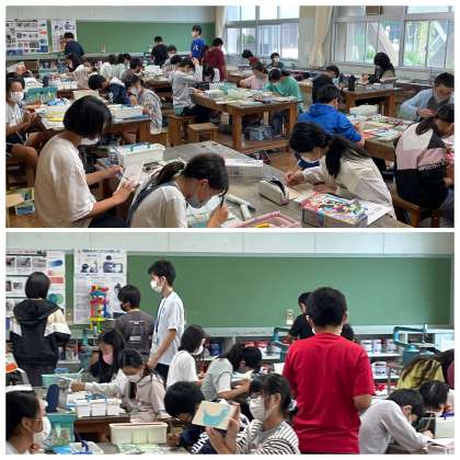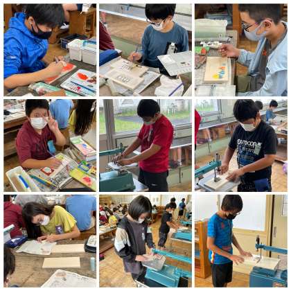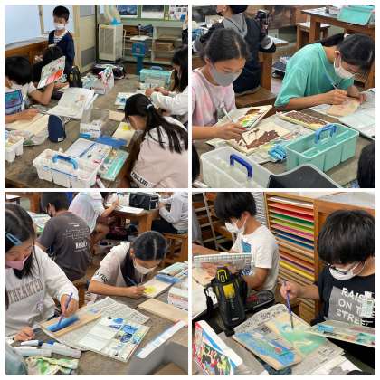 6年生の図工の授業のようすです。テープカッターづくりを進めていました。糸のこを上手に操ってイメージ通りに木材を切り出すことができましたね。いろぬりも丁寧に行って、芸術性の高いテープカッターができそうです。