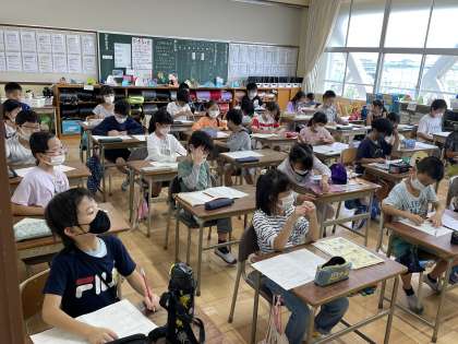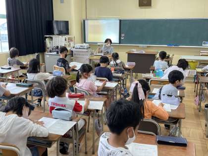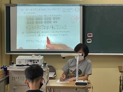 4年生の算数の授業のようすです。あまりのあるわり算の文章問題に挑戦して、解き方を確認していました。わり算の式を立てること、商やあまりが何を表しているか考えることなど、ポイントについて理解を深めていきました。