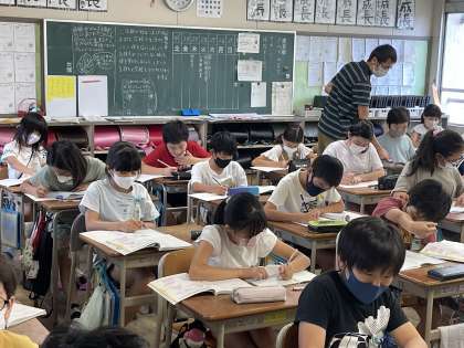 5年生の算数の授業のようすです。分母の数の異なる分数のたし算とひき算を通分をしてから行う練習をしていました。たくさん問題を解いて自信をつけることができましたね。