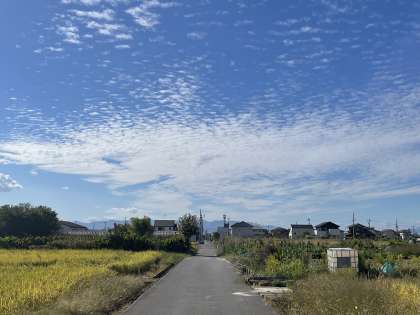 写真は昨日の学校の近くから西の方角を向いて撮ったものです。青い空と白いやさしい雲が広がる様子がとても素敵でシャッターを押してしまいました。今日は家庭の日ですね。天気は明日は下り坂のようですが、今日は秋晴れのよい一日になりそうです。家族で散策に出かけて、お話がいっぱいできる日になるといいなと思います。