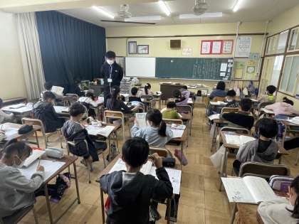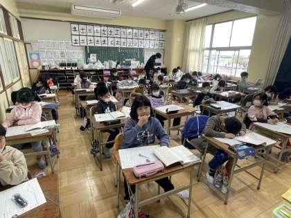 3年生の国語の授業のようすです。「『ちいちゃん』のようすから、『ちいちゃん』のまわりからうしなわれたものを考えよう」というめあてで学習を進めていました。