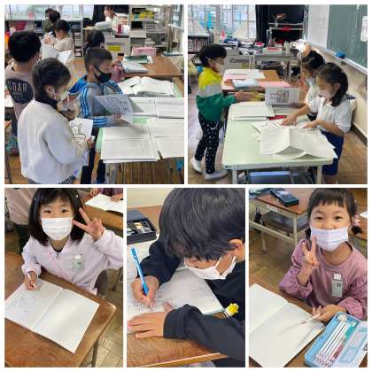 1年生の教室のようすです。今朝も元気なあいさつの声で迎えてくれました。「読書カード2枚目になったよ」とうれしそうに教えてくれる子が何人もいました。コスモス読書週間に、本に親しんでくれていることが伝わってきます。今日は3時間の授業ですが、元気に過ごせるように応援していますよ!