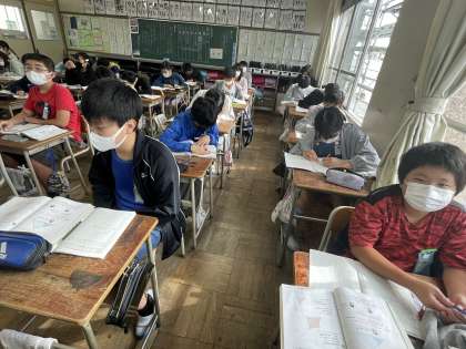 6年生の昨日の算数の授業のようすです。「1つの頂点を同じにしたときの拡大図や縮図のかき方を考えよう」というめあてで学習を進めていました。試行錯誤をしながら条件に合う図形のかき方を考えていました。