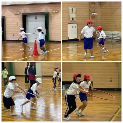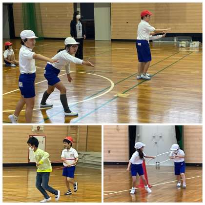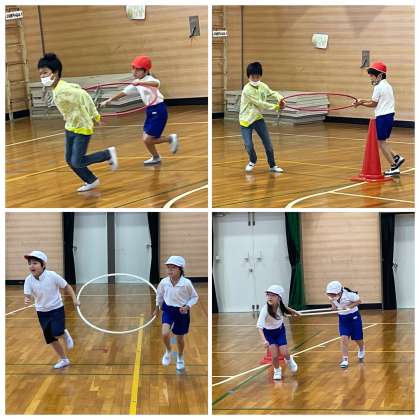 ひまわり組さんの体育のようすです。スポーツ大会に向けて、競技の練習に取り組んでいました。2人で息を合わせて、安全に速く移動できるようにがんばりました。一生懸命に協議する姿、応援する姿がとてもすてきです。本番に向けて、みんなで協力して楽しく競技できるようにがんばりましょうね。