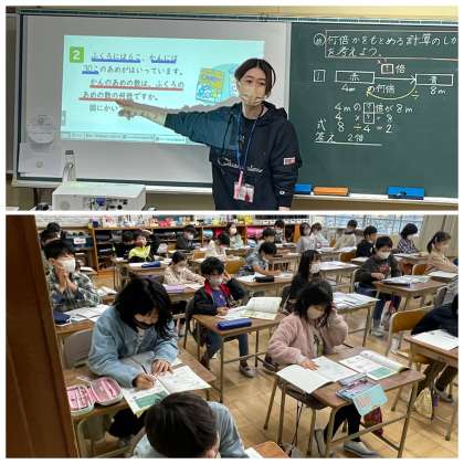 3年生の算数の授業のようすです。「何倍かを求める計算のしかたを考えよう」というめあてで学習を進めていました。関係図をつかって数量関係を確認してから計算の式を作ることができましたね。
