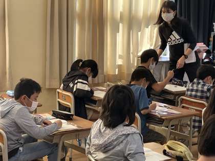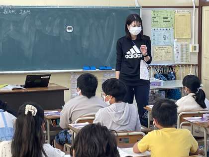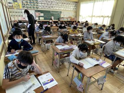 4年生の昨日の算数の授業のようすです。「L字型の面積の求め方を考えよう」というめあてで学習を進めていました。長方形や正方形の面積の求め方を使って、工夫して面積を求める学習です。どんな方法を思いついたかな。