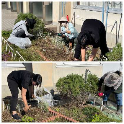 昨日の学校の花壇のようすです。とても暖かな日になりました。午前中いっぱいの時間を使って、朝びっしょりになって、ガーデニングボランティアのみなさんが、保健室前や中庭の花壇の整備をしてくださいました。伸びたお花は剪定して次のお花をつけるための準備をしていただきました。また、新しいお花もたくさん仲間に加わりました。素敵なお花をありがとうございます。みんなで花の成長を楽しみたいと思います。
