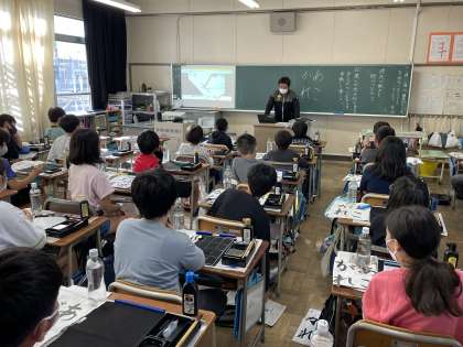 5年生の昨日の書写の授業のようすです。「穂先の動きと線のつながり」について「筆への力の加え方を考えながら、つながりを意識してかこう」というめあてで「あこがれ」の文字を書いていました。
