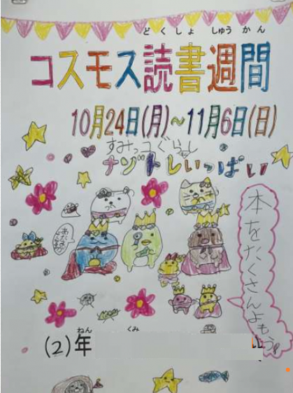 11月5日(土)コスモス読書週間【2年生】 公開日 2022/11/05 更新日 2022/11/05 2年 コスモス読書週間も残り今日と明日の2日間となりました。たくさんの本に出会って心の栄養をたっぷりと取ることができましたね。週末もゆっくりと読書を楽しんでほしいと思います。2年生の子が描いてくれたポスターを紹介します!