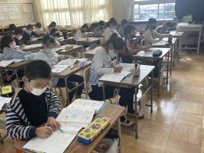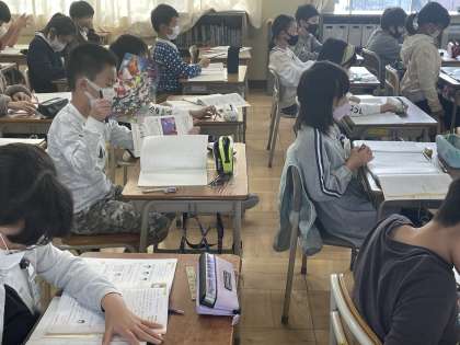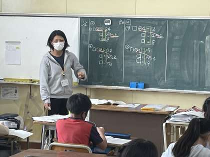 4年生の算数の授業のようすです。□を使った式について、「=」の左側の記号と右側にある記号を比べて、どんなことが言えるか考えていました。