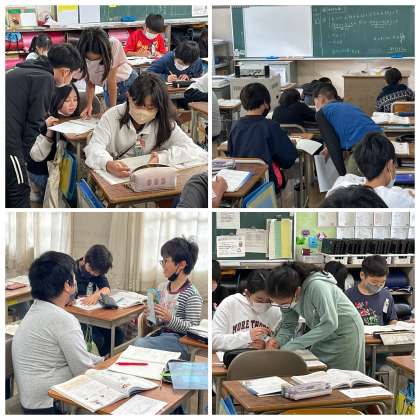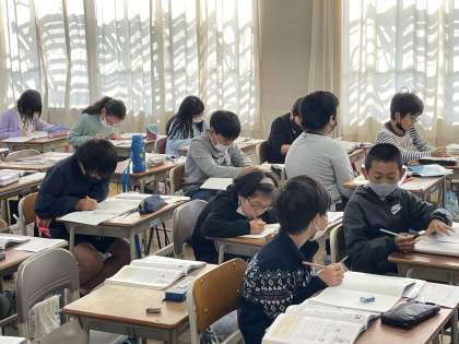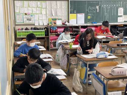 5年生の算数の授業のようすです。自分の10歩分の進んだ長さを5回測って、1歩はどのくらいの長さなのかについて計算で求めていました。
