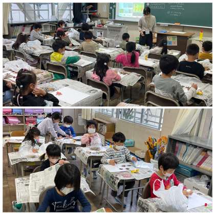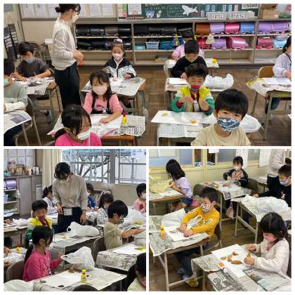 1年生の生活科の授業のようすです。「おちばをつかってはりえをつくろう」というめあてで学習を進めていました。まず紙の上に落ち葉を並べて、構図を考えてからボンドづけしていきました。どんな貼り絵ができたかな。