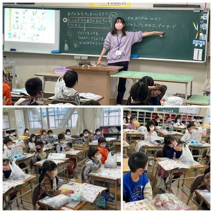 1年生の生活科の授業のようすです。「じぶんだけのあきのおもちゃをつくろう」というめあてで学習を進めていました。ドングリや折り紙、紙コップを使ってどんなおもちゃが出来上がったかな。
