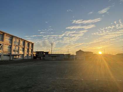土曜日の朝を迎えました。写真は6時半ごろの小学校のグランドのようすです。朝陽が輝いて校舎を照らしてくれていました。